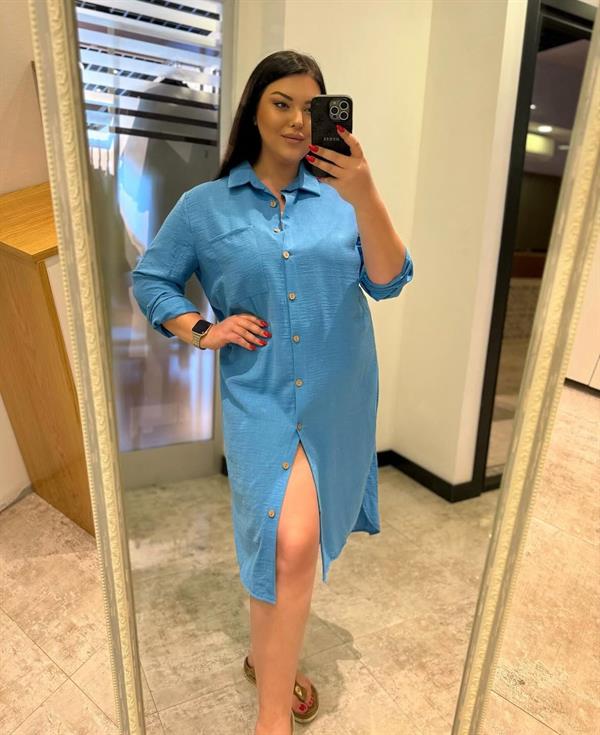 Büyük Beden Keten Kumaş Gömlek Elbise - Mavi (FBB340447)