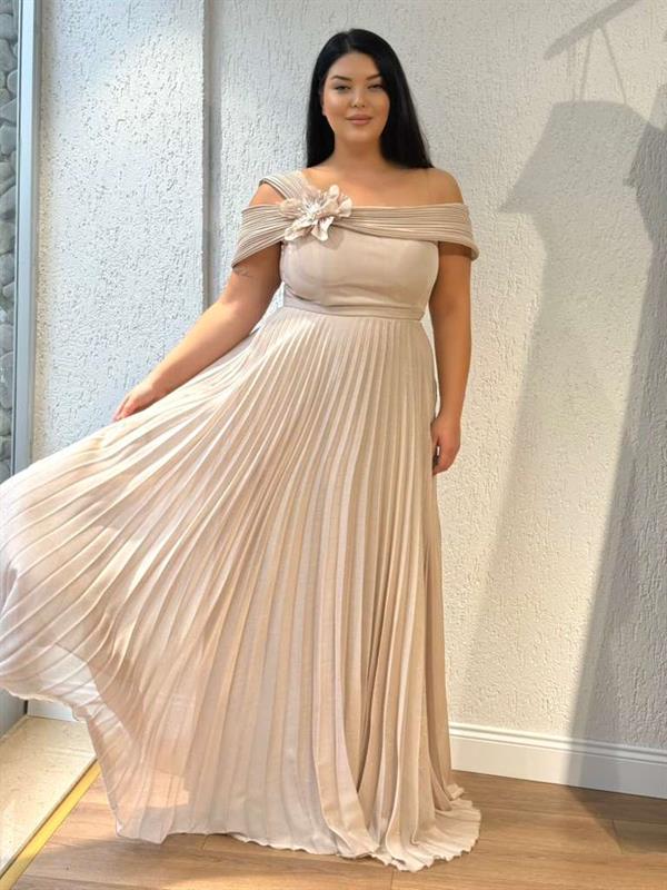 Büyük Beden Pileseli Kadın Abiye Elbise - Bej (25650)