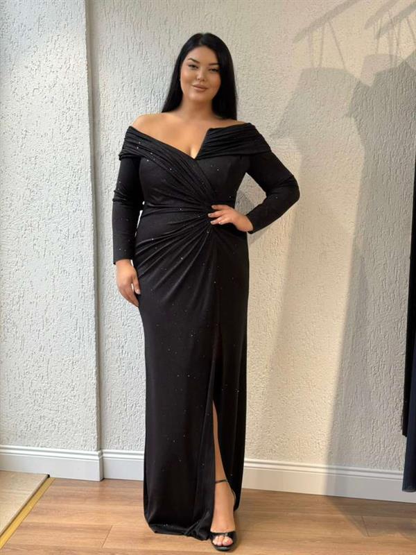 Büyük Beden Simli Yaka Dekolteli Kadın Abiye Elbise - Siyah (25652)
